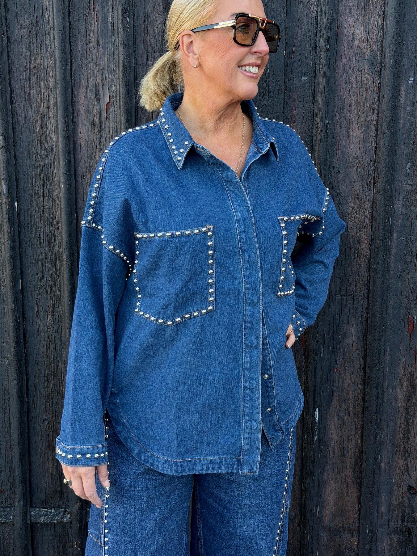En riktigt snygg jeansskjorta med nitar som detaljer. Är kortare i arm och har en oversized look.