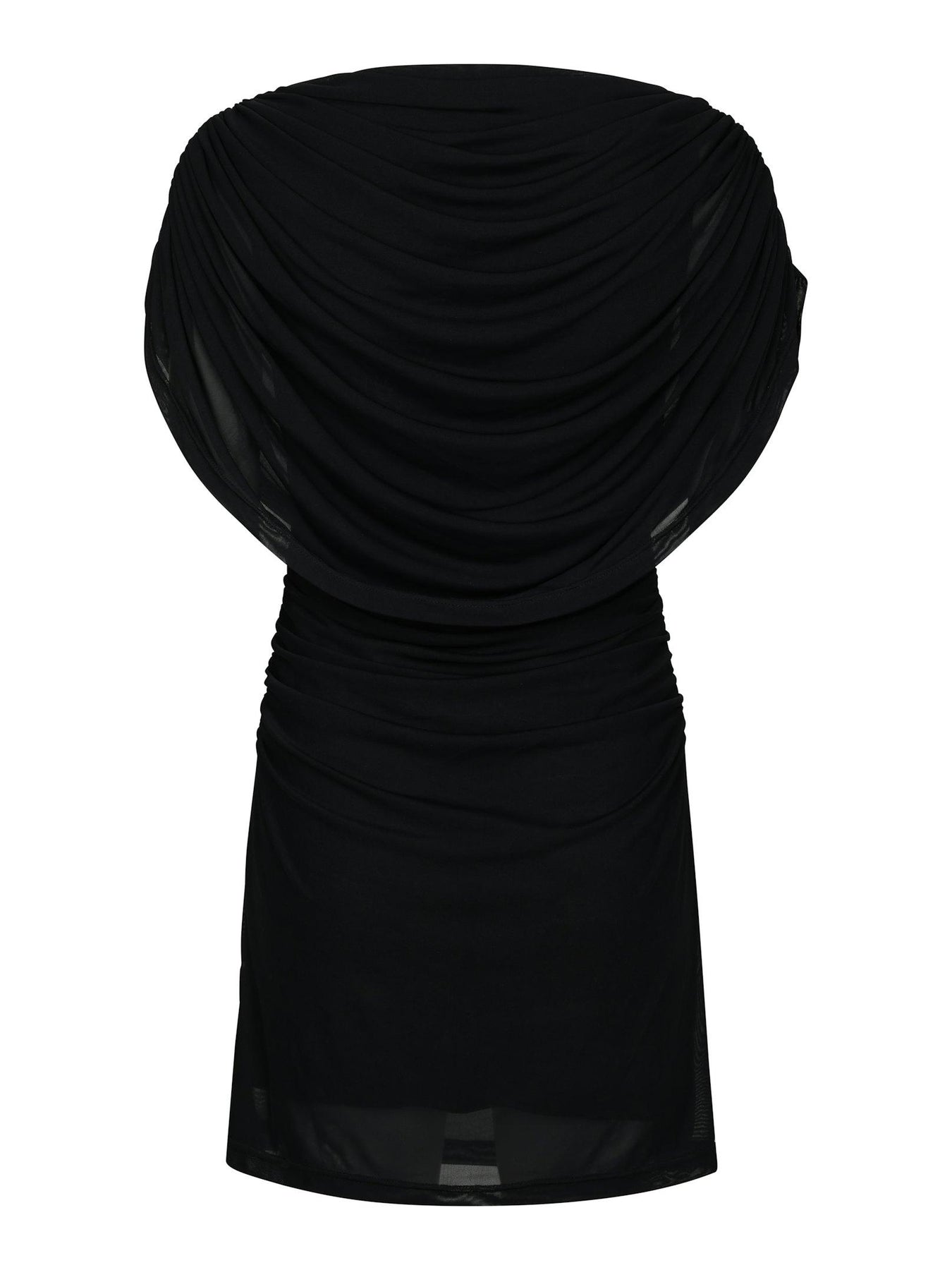 Söt kort meshklänning med smock längs sömmen och med draperad vattenfallseffekt vid halsen fram.